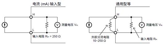 有兩種測量直流電流方法:一是使用電流輸入型(GX90XA-10-C1)模塊,另一種是用直流電壓量程配合分流電阻使用,各自電路圖如下: