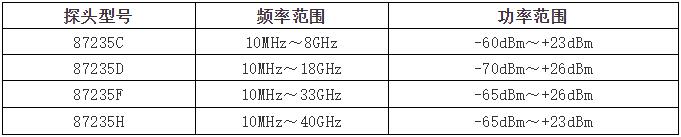 87235系列單功率探頭動態(tài)范圍最高可達(dá)96dB,是我司動態(tài)范圍最大的功率探頭。87235系列推出4個型號,頻率覆蓋10MHz~50GHz。