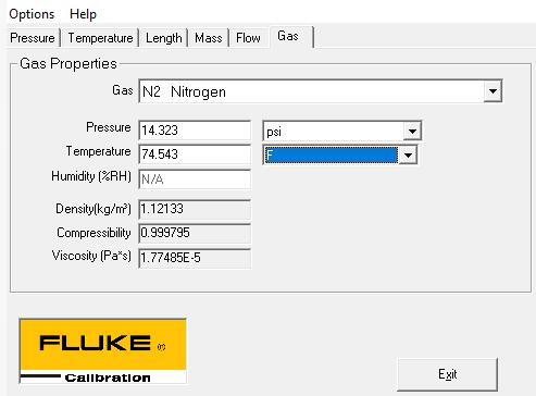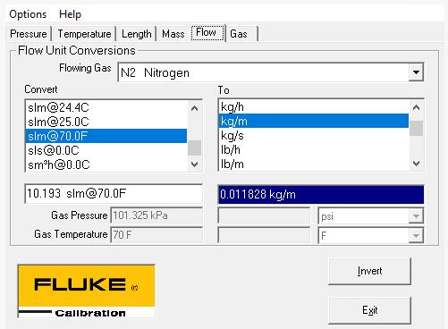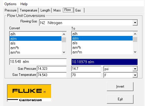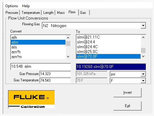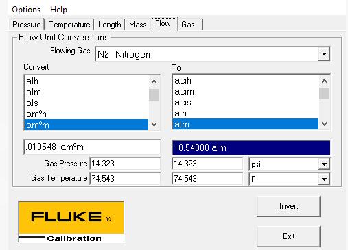 上圖所示例子中,介質(zhì)為氮?dú)?,?dāng)前DUT壓力為14.323 psia(需要絕對壓力),DUT溫度為74.543F。此溫度壓力下氮?dú)饷芏葹?.12133 kg/m3。