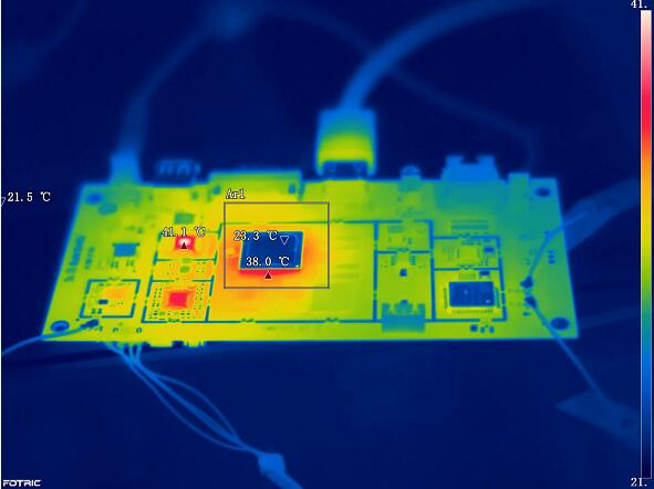這是一張由FOTRIC 280熱像儀(分辨率640×480)拍攝的電路板熱像圖,超高的紅外分辨率,使得有效測溫點達307200個,能高效無盲區(qū)地對電路板溫度分布進行檢測,精準(zhǔn)測溫,高清成像。