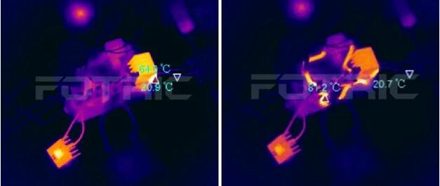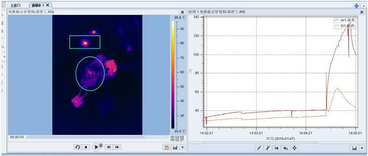 整流橋溫度升高的過程只有300ms左右,這一過程很難通過拍照捕捉,而FOTRIC 288 的全輻射熱像視頻錄制功能,可以實時記錄通電過程的溫度變化和分布情況,可隨時查看溫升曲線,還可以對視頻進行后期的任意分析,便于發(fā)現(xiàn)問題,改善設(shè)計。