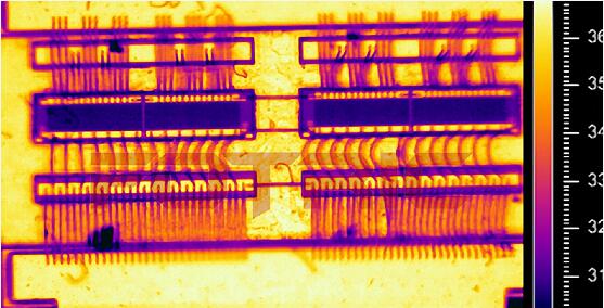 未封裝芯片小至0.5mm×1mm,F(xiàn)otric289 熱像儀配置20微米微距鏡后,可直接對未封裝前的細小芯片進行微米級的微觀溫度成像檢測,發(fā)現(xiàn)過熱連接點,及時改進芯片設(shè)計。
