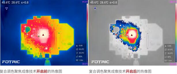 FOTRIC 自有的復(fù)合調(diào)色聚焦成像技術(shù),具有出色的熱成像效果,十分適用于在復(fù)雜場景中,分析特定目標(biāo)的細微溫差,有利于在檢測現(xiàn)場快速得出正確的診斷結(jié)論。