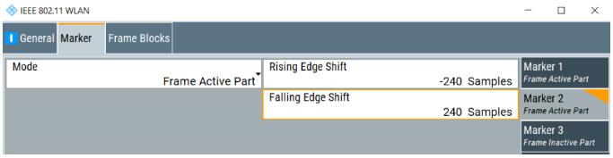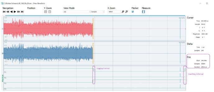 配置PA_EN Signal,這里實(shí)際上是對(duì)波形設(shè)置相應(yīng)的Marker信號(hào),該Marker信號(hào)一方面用于使能功率放大器,另外一方面用于CMP180動(dòng)態(tài)EVM測(cè)量的觸發(fā),建議這里配置成除了Marker1以外的觸發(fā),因?yàn)镃MP180的默認(rèn)Marker1是Restart Marker。信號(hào)采樣率為240MHz,1us即需要配置240sample作為Marker偏移,Rising Edge需要提前,所以配置為-240 Samples,F(xiàn)alling Edge在 frame Active之后,所以配置為+240 Samples。在配置好了之后,還可以使用ARB Toolbox的工具去檢查一下波形文件以及PA_EN信號(hào)的配置。