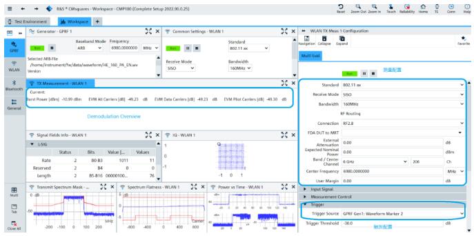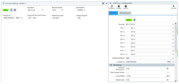 測(cè)試配置方面,CMP180使用GPRF Generator加載剛才配置的波形文件,如圖8所示,CMP180產(chǎn)生了一個(gè)6980MHz,輸出功率為 -10dBm的HE_160信號(hào)。