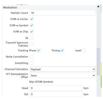 測(cè)量方面,需要按照波形文件進(jìn)行相應(yīng)的配置。這里我們可以配置相應(yīng)的解調(diào)參數(shù),例如Standard,SISO or MIMO,信號(hào)帶寬,頻點(diǎn)等信息,需要注意的是需要使用正確的觸發(fā),才可以得到相應(yīng)的動(dòng)態(tài)EVM測(cè)量結(jié)果。另外因?yàn)橛绊慐VM的因素眾多,我們還需要注意相關(guān)解調(diào)配置,這里比較重要的是信道估計(jì),即Channel Estimation和跟蹤算法 Phase,Timing,Level跟蹤是否啟用。除此以外儀表還提供了額外的噪聲消除和平滑的方法來(lái)改善對(duì)于信號(hào)的EVM解調(diào)性能。