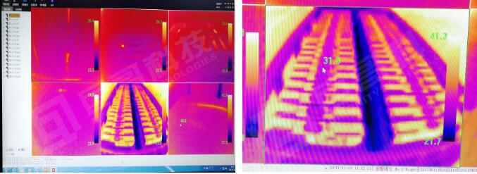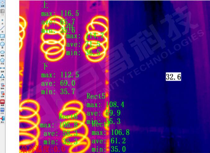 汽車懸架彈簧在車橋和車架或車身之間作彈性聯(lián)系,承受和傳遞垂直載荷。在塑形及噴漆兩階段的生產(chǎn)過程中,巨哥科技的熱像儀同時對上下兩層彈簧進行測溫,觀測溫度恒定情況下的彈簧溫差,并框選不同區(qū)域進行全方位覆蓋和定位,便于不良品的及時挑出。