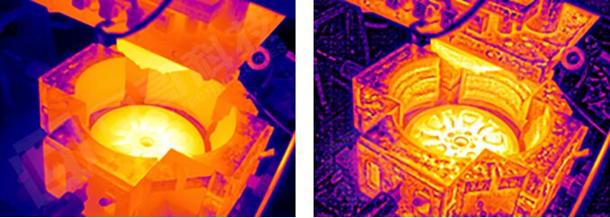 在汽車輪轂鑄造過程中,模具的狀態(tài)和溫度分布至關重要。巨哥科技的熱像儀測溫精確,可有效監(jiān)控模具狀態(tài),控制工藝過程。因模具溫度高,測溫范圍大,一些微小溫差在圖像展示時受到抑制。巨哥科技的DDE數(shù)字細節(jié)增強技術將這些細微的溫度分布細節(jié)也清晰展現(xiàn),有利于及時發(fā)現(xiàn)模具和工藝可能存在的問題。
