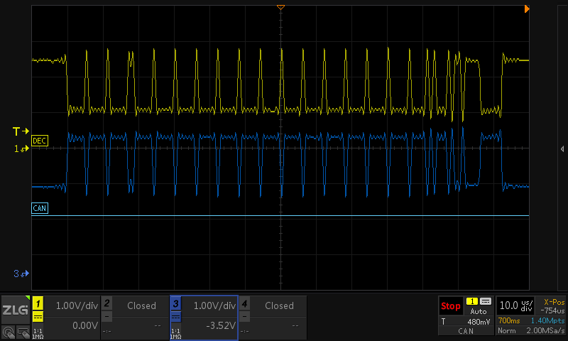 我們采集一段波形CAN總線信號,用ZDS5054 Pro示波器對該信號進行采集并顯示。第一次實驗我們將示波器存儲深度設(shè)置為1.4Mpts,采樣時間設(shè)置為280us,采集完成一幀波形并按下暫停后,將波形調(diào)整至合適位置,波形和解碼結(jié)果如圖1所示,此時屏幕時基為10us/div。第二次實驗我們將示波器存儲深度同樣設(shè)置為1.4Mpts,但采樣時間設(shè)置為700ms,采集完成并按下暫停后將波形調(diào)整為第一次實驗設(shè)置的參數(shù)即10us/div,獲得的一幀CAN總線波形和解碼結(jié)果如圖2所示。