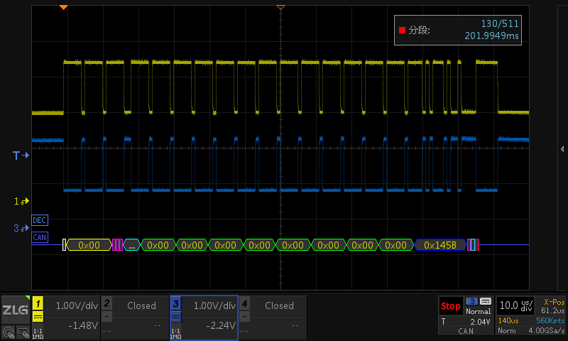 如果我們此時只想獲得通信的數(shù)據(jù)內(nèi)容,而無需幀與幀之間的等待時間,那么此間隔對采集數(shù)據(jù)來說并無意義,這時候我們是不是就可以考慮讓示波器只記錄有用信息的那一段,無用信息的那段就不記錄,這樣不就可以節(jié)省大量的存儲深度,從而緩解甚至解決之前出現(xiàn)的那種失真問題了嗎?所以,此處便是我們講解的重點功能——分段存儲。如圖4通過設(shè)定CAN的起始位為觸發(fā)條件,從而利用分段存儲功能獲得511幀CAN信號波形,并且每一幀波形都不存在失真。