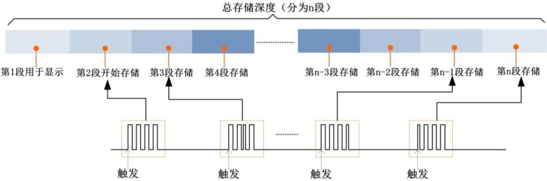 存儲原理如下圖 5所示,總的存儲深度分為 n 段,第 1 段用于顯示,第 2 段開始存儲,也就是當發(fā)生第一次觸發(fā)時采集的數(shù)據(jù)存儲到第2段存儲空間中(此處不同示波器的策略可能存在差異,但觸發(fā)后再存儲的本質(zhì)沒變化),當?shù)?段存儲空間存儲滿之后, 結(jié)束第一次觸發(fā),等待第二次觸發(fā)的到來,觸發(fā)后把數(shù)據(jù)存儲到第 3 段存儲空間中,以此類推。