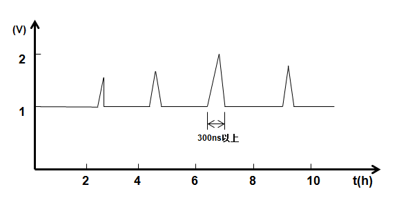 整個振動試驗時長 8 個小時,在整個過程中連接器可能會出現(xiàn) 0~幾十次失效區(qū),時長是 300ns 以上,幅值大小不確定(正常情況下電平為 1V),如下圖6所示。
