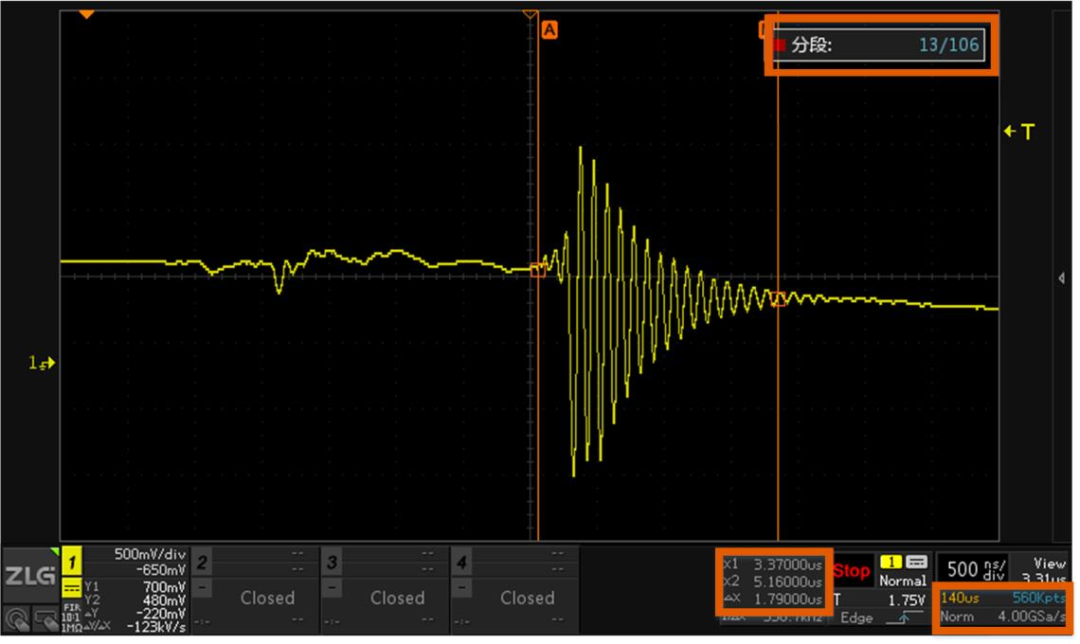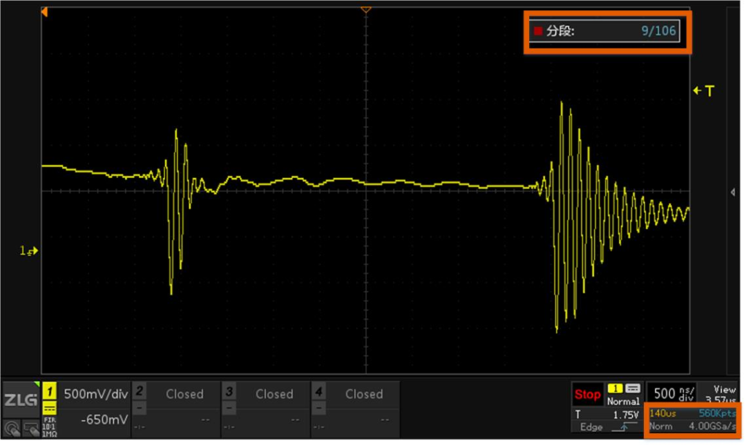 由上述例子,相信我們對分段存儲有了一定的概念理解。所謂分段存儲,既通過設(shè)置觸發(fā)的方式,對每次觸發(fā)采樣得到的數(shù)據(jù)存放到各段的存儲空間中,從而可以更高效地利用示波器的存儲深度且保證波形細節(jié),并且也能夠在足夠的采樣率下捕獲多個波形事件,以便進行有效的分析。