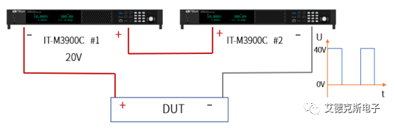 ITECH向用戶推薦了使用兩臺雙向直流電源的測試方案。兩臺電源的正極和正極連接,負極分別接DUT的正極和負極。其中#1輸出恒定的20V,#2電源通過list編輯0V和40V的1Hz的電壓波形。當#2處于0V時,加載在DUT兩端的電壓為-20V;當#2輸出40V時,則加載在DUT兩端的電壓為+20V,這樣就實現(xiàn)了待測物兩端的連續(xù)的正負電壓切換。這種接法下一臺電源作為主輸出時,另外一臺相當于載接受電流的倒灌,因此需選擇雙向電源。用戶選擇雙向直流電源IT-M3900C完成這項測試,日常還能將其作為兩臺獨立的實驗室電源使用,感到非常滿意。以下為測試原理接線圖。