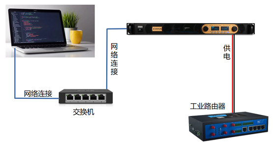 測試時,將電源通過交換機連接到工程師的電腦端,電源的另一端連接工業(yè)路由器產(chǎn)品,工程師即可通過上位機軟件控制電源的工作。