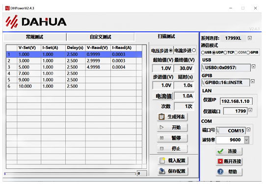 在上位機軟件中點擊“連接”,即可選擇上位機軟件界面上方的常規(guī)測試、自定義測試和掃描測試三種測試模式來操作電源。