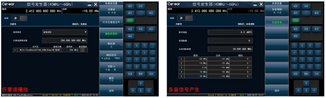 (3)任意波播放(3種文件格式)可用于加載WLAN、2/3/4/5G等通信協(xié)議信號;雙音信號產(chǎn)生可用于射頻芯片的三階交調(diào)指標(biāo)測試。