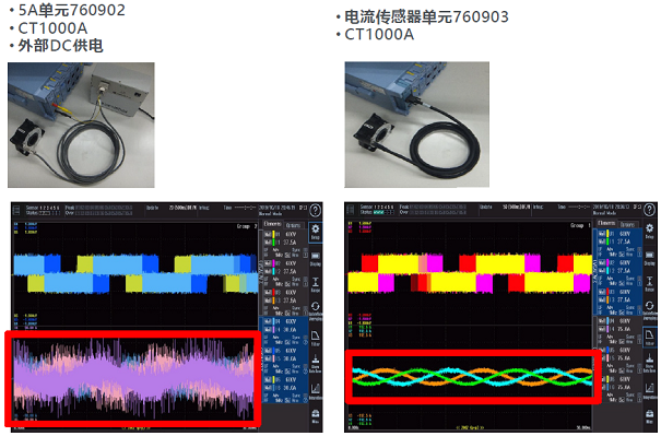 左圖中是采用5A的輸入單元以及CT1000A傳感器,使用外部直流供電。右圖采用電流傳感器單元760903,通過橫河高質(zhì)量線纜與CT連接。使用這兩種配置去測(cè)量同一個(gè)變頻器的輸出功率。