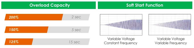 AFV可承受高達(dá)125%、150%、200%的電流過載;且透過軟啟動功能,能有效抑制開機(jī)時的高啟動電流,此功能適用于馬達(dá)、壓縮機(jī)等電機(jī)類產(chǎn)品,提供可靠的效能,達(dá)到長久的機(jī)器壽命
