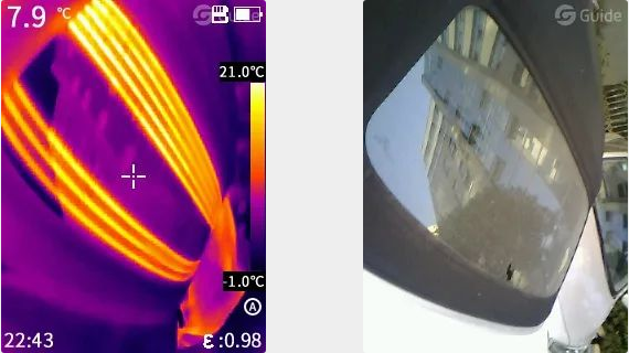 借助紅外熱像儀可以快速獲取后擋風(fēng)玻璃(后視鏡)在電阻絲加熱過程中的熱像圖,分析其溫度分布和溫度上升趨勢,還可分析加熱絲是否有斷裂,可避免由于電阻絲分布不均勻或某個點(diǎn)的電阻出現(xiàn)異常造成玻璃局部受熱,致使玻璃損壞的安全風(fēng)險。