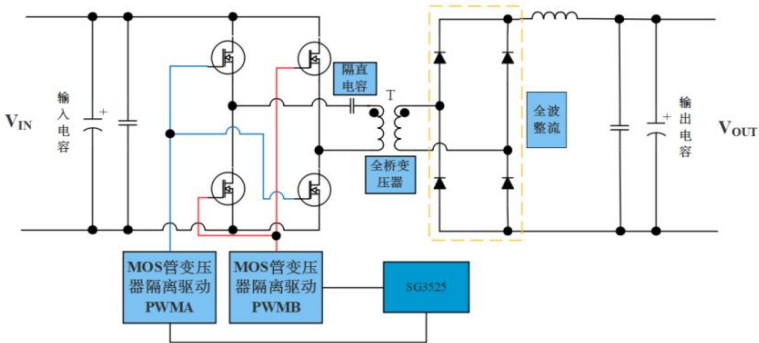 該實驗板的硬件組成框圖如下圖所示。其中主要包括:輸入濾波電容、控制芯片SG3525、N-MOSFET功率開關(guān)、整流二極管、儲能電感、輸出濾波電容、驅(qū)動變壓器、變壓器、隔直電容。