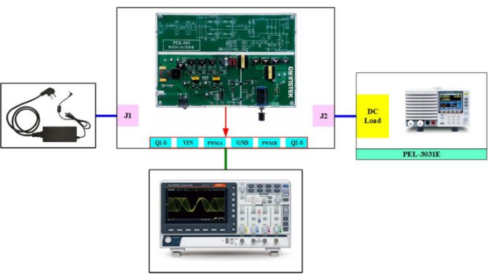 實驗板、適配器、電子負載以及示波器之間的連接方法如圖所示。電源適配器的插頭與實驗板的左側(cè)插座J1連接,示波器表筆的地線連接測試端子“GND”,采集端連接“PWMA”或者“PWMB”。