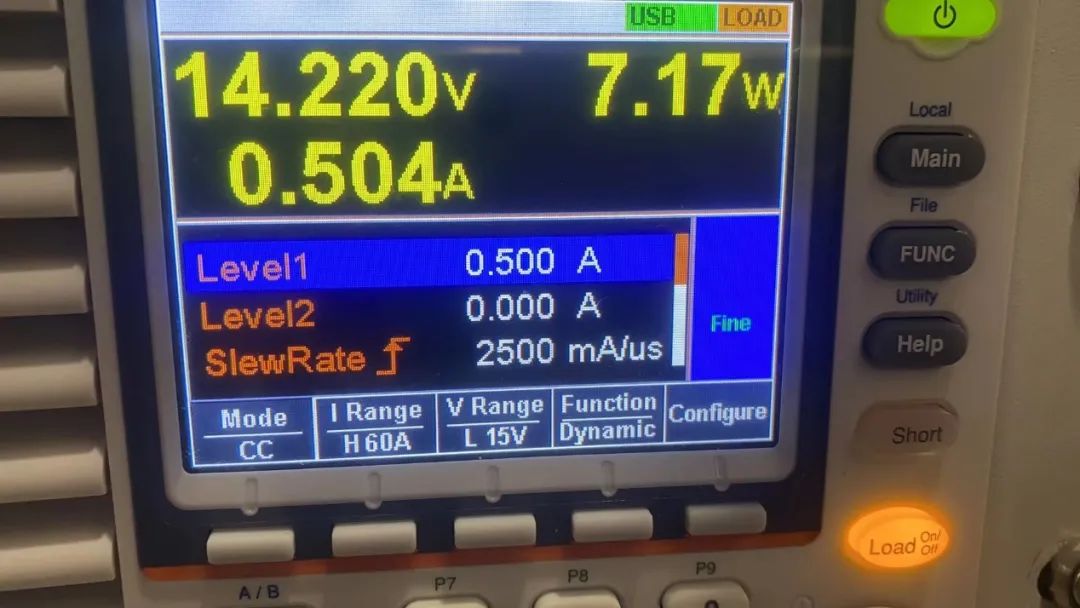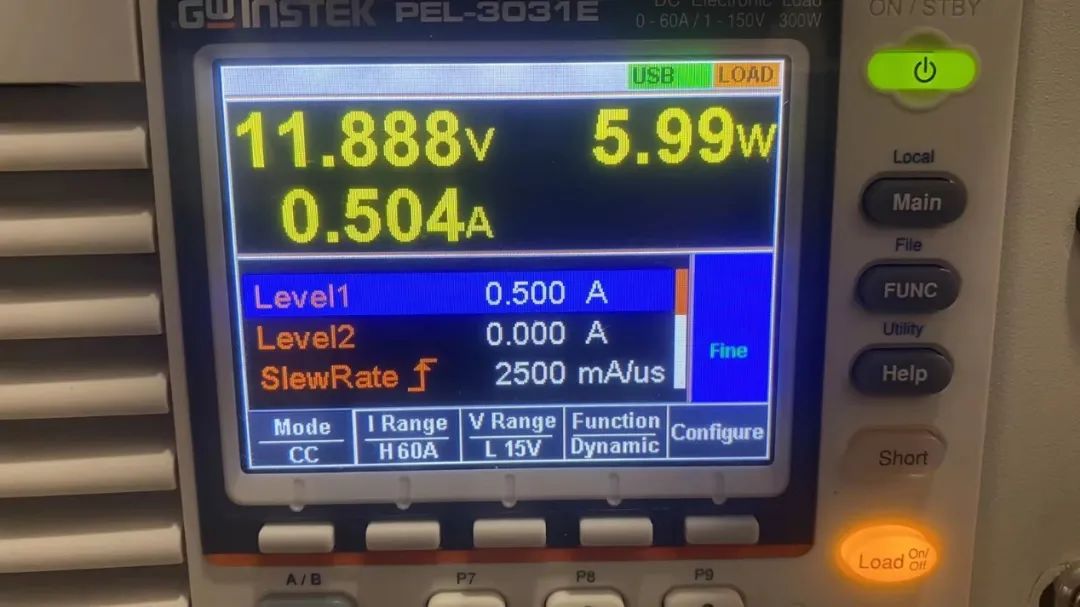輸出端接電子負載,電子負載設(shè)定為CC MODE,電流值設(shè)為0.5A。將多圈電位器旋至最大位置,用萬用表測試并記錄輸出電壓(或直接讀取電子負載上之輸出電壓),用示波器觀察并記錄PWM的占空比D。