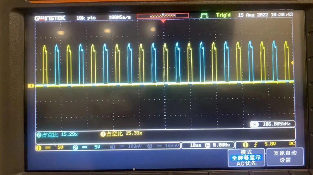 下圖是測量開關(guān)管的控制信號(黃色是開關(guān)管A,藍色是開關(guān)管B):