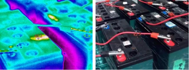 通過紅外熱像儀可立即發(fā)現(xiàn)電池表面有明顯的“白斑”,紅外圖像中,色彩的深淺實際代表溫度的高低。“白斑”無疑作為異常發(fā)熱點,可以判斷此隱患電池可能存在內(nèi)部漏泄或短路的危險,需要深入檢查,甚至替換。