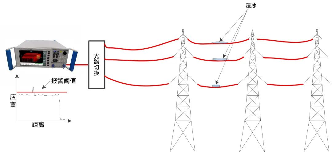 圖4為基于6419A的OPGW覆冰監(jiān)測系統(tǒng),通過選用OPGW光纜中任一根單模光纖,實(shí)時(shí)監(jiān)測全線路應(yīng)變變化值,當(dāng)線路出現(xiàn)覆冰現(xiàn)象時(shí),6419A可綜合判定覆冰嚴(yán)重程度并及時(shí)給出預(yù)警信息和定位信息。