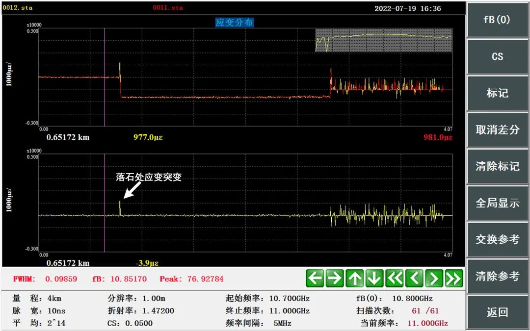 圖5為基于6419A的隧道安全監(jiān)測預(yù)警系統(tǒng),當(dāng)隧道中任何地方出現(xiàn)滲漏導(dǎo)致墻體微形變,或者極端天氣導(dǎo)致隧道口上方山體微錯(cuò)位或滾石滑動(dòng)時(shí),會(huì)導(dǎo)致此處光纜被拉伸或擠壓,應(yīng)變參量急劇變化,此時(shí)6419A通過實(shí)時(shí)監(jiān)測光纜應(yīng)變值的變化量,如圖6所示,為隱患的分析及預(yù)判提供數(shù)據(jù)支撐,以便監(jiān)測系統(tǒng)及時(shí)發(fā)出預(yù)警信息,通知控制中心立即采取措施,可有效的提升隧道管理的應(yīng)急管理水平和災(zāi)害預(yù)防能力。
