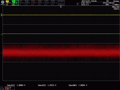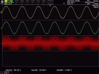 當我們將標準信號源輸出一個220V 60Hz的正弦波,我們可以看到示波器上顯示的波形除了基準噪聲還疊加了一個60Hz的正弦波,使噪聲上升至2.73V。