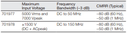 以701977和701978為例,它們在60Hz時的共模噪聲抑制比可達到80dB(注:許多廠家標注產(chǎn)品該參數(shù)時習慣于定義為共模噪聲與差模信號的比值,與通常的定義不同,因此會有負號,本質(zhì)上沒有區(qū)別),換算成比值的形式為10000,即測得的差模信號為共模噪聲的一萬倍,而實測值往往要比這個標定的數(shù)值還要高,基本上可以忽略共模噪聲對差分信號的影響。