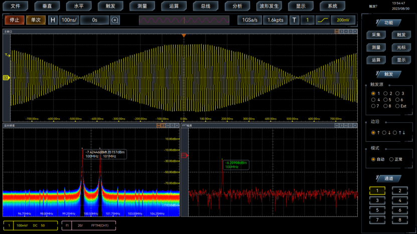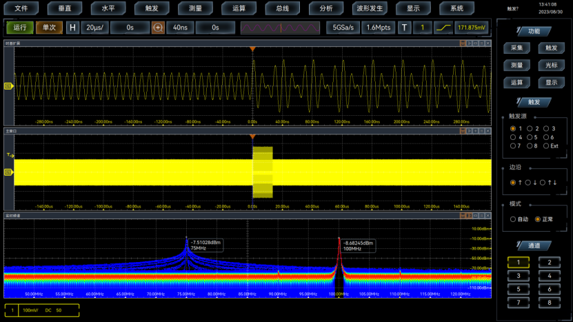 電科思儀針對用戶測試需求,開發(fā)出了具有全硬件實時頻譜分析能力的示波器——4457系列數(shù)字示波器,采用全硬件并行處理算法設(shè)計,F(xiàn)FT刷新頻率高達(dá)40萬次/秒,最大中心頻率達(dá)4GHz,實時分析帶寬為320MHz,同時采用數(shù)字熒光疊加處理顯示技術(shù),大大提高了捕獲瞬態(tài)信號的概率,增強了查看偶發(fā)事件的能力。