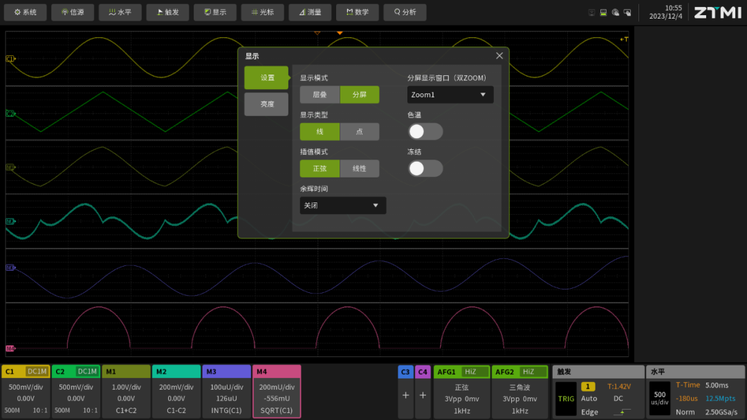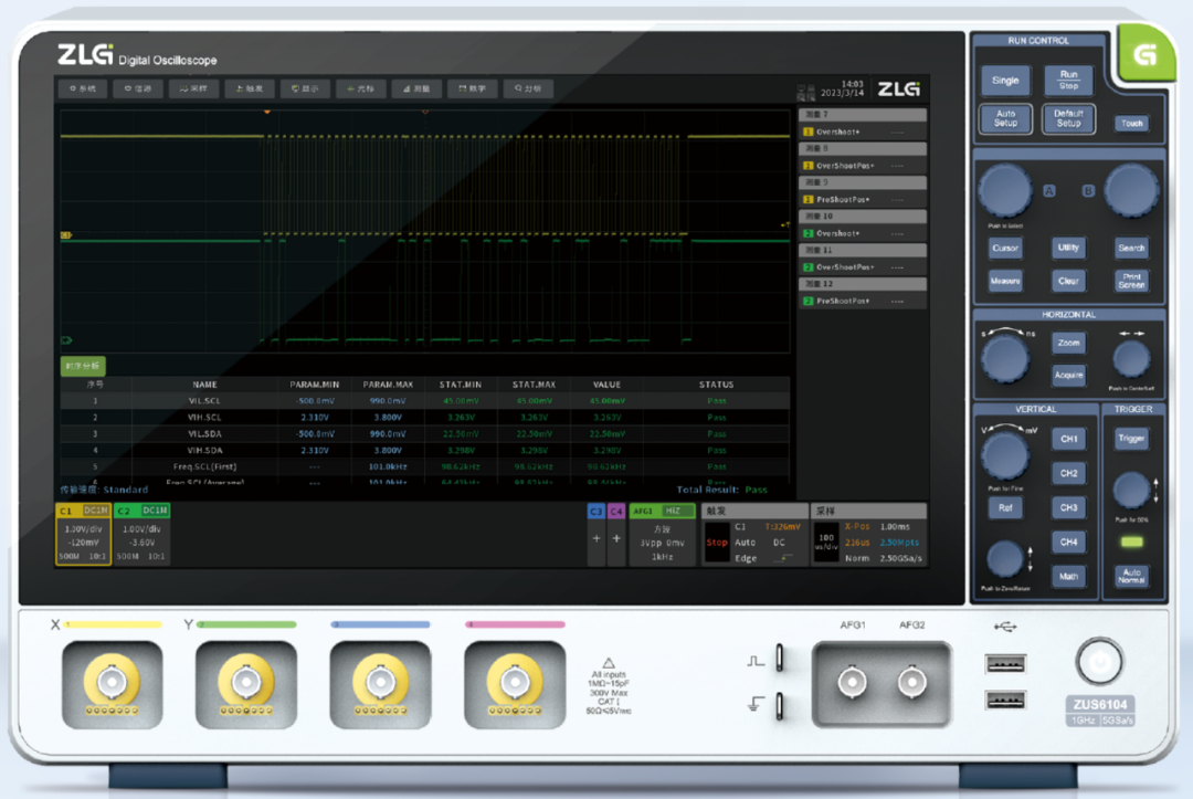 ZUS6000不僅功能強大,并致力于提升工程師對數(shù)據(jù)分析處理的效率。其中值得一提的就是ZUS6000獨特的多通道波形運算功能和波形分屏顯示功能。接下來我們通過ZUS6000示波器進行功能展示。