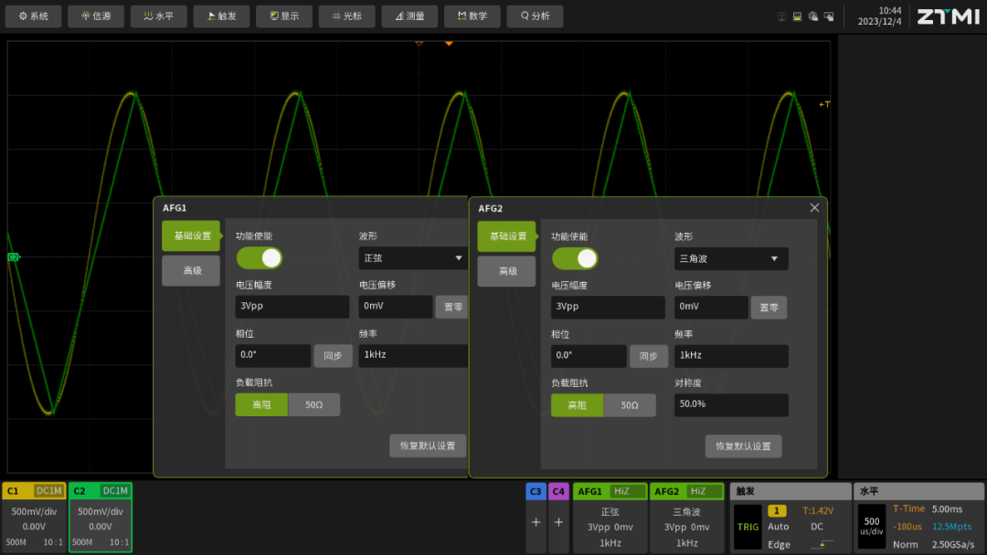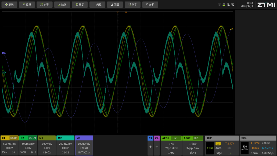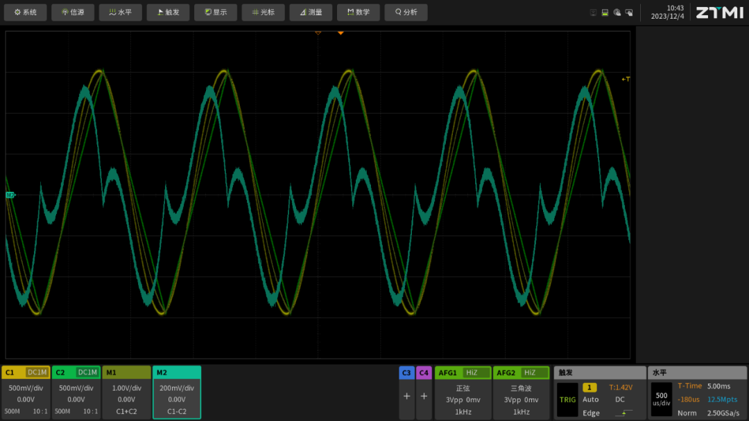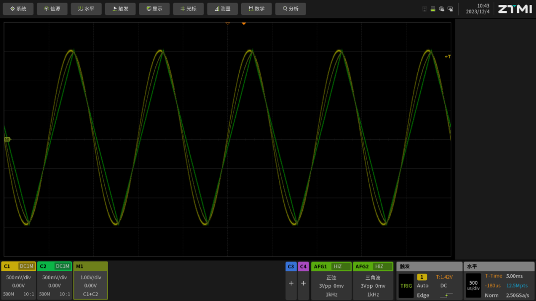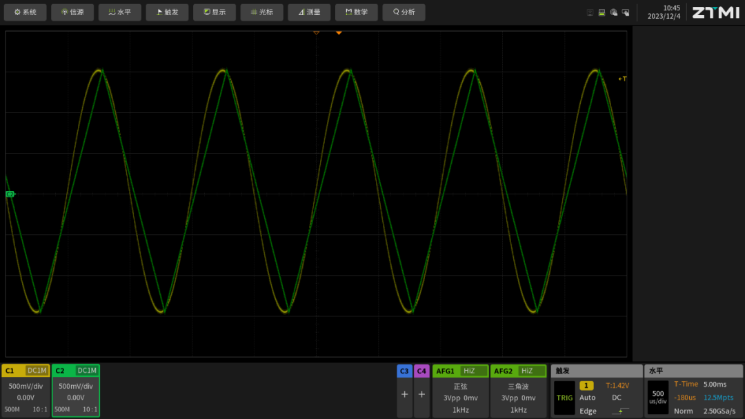 首先我們通過ZUS6000自帶的兩路AFG信號發(fā)生器產(chǎn)生兩個信號,分別是頻率1KHz,電壓幅度為3Vpp的正弦波信號和頻率1KHz,電壓幅度為3Vpp的三角波信號,輸入示波器的測量通道1和通道2,通道1和通道2的垂直檔位都為500mV/div,水平時基為500uS/div,如圖所示。