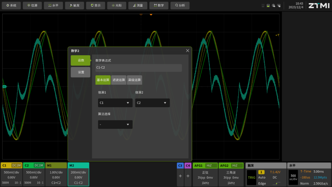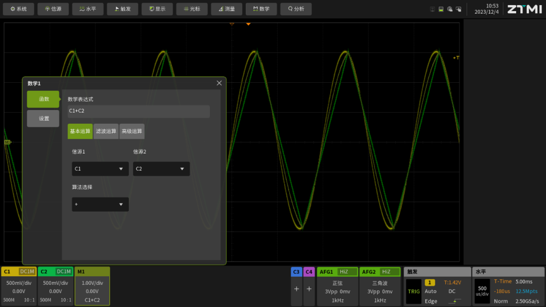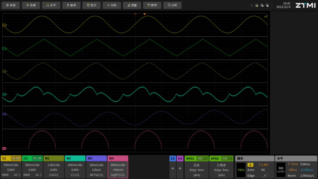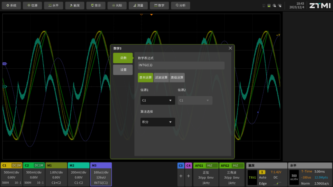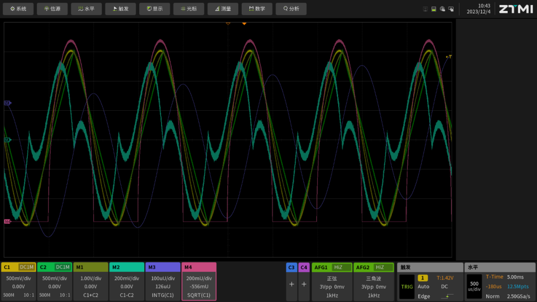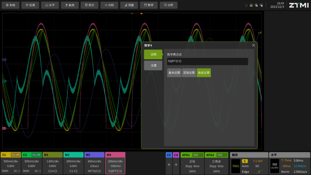 接下來我們打開ZUS6000的波形運算功能。ZUS6000支持最多同時打開4路波形運算。我們設(shè)置第一路波形運算為基本運算C1+C2,設(shè)置第二路波形運算為基本運算C1-C2,設(shè)置第三路波形運算為C1通道的積分運算,設(shè)置第四路波形運算為高級運算SQRT(C1)。設(shè)置界面與波形顯示分別如下圖。