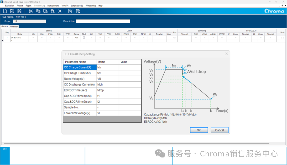 計算公式中的各項參數(shù)點,建議測試設備必須具備1ms時間分辨率抓取數(shù)值,才能精準推算出ESR結果。 測試設備必須具備自動推算算法,測試完畢即完成Capacitance及DCIR值推算,提高測試效率與可靠性。