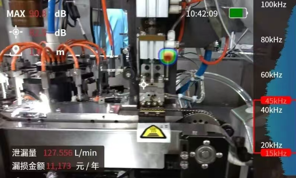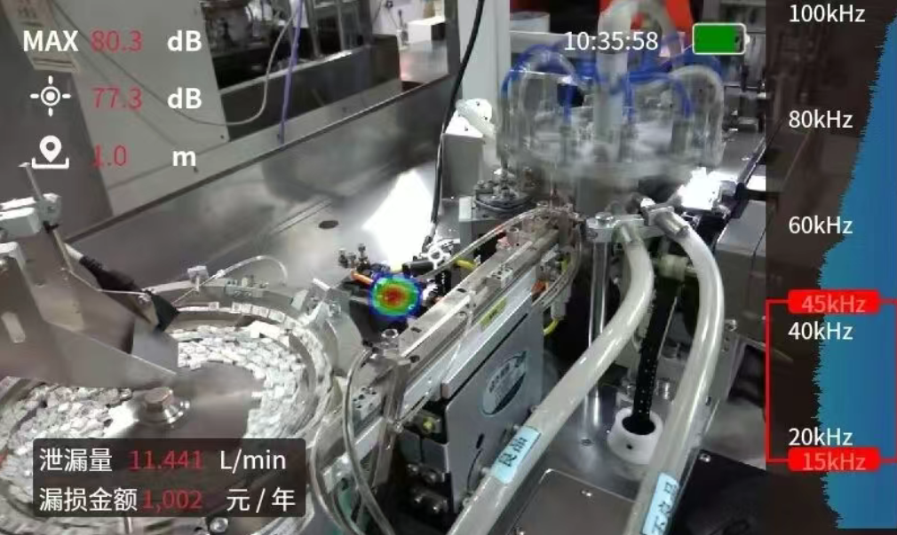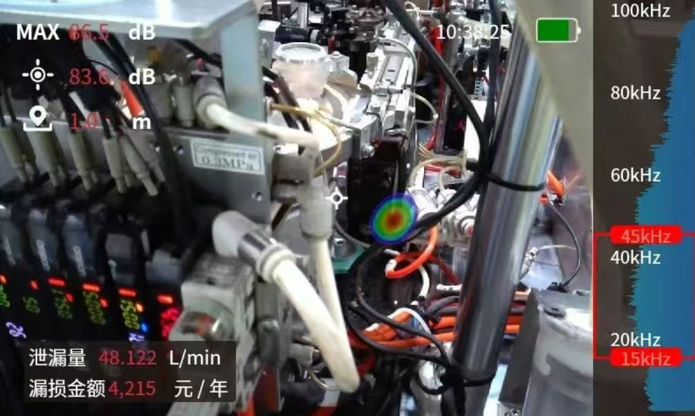 本次檢測,UT568F成功識別出多處隱蔽泄漏點,涵蓋儲氣罐法蘭、氣動閥門接頭等關(guān)鍵部位??蛻衄F(xiàn)場反饋:“通過UT568F,一眼就能看到問題在哪,連細微泄漏都無處遁形,效率和準確性都很好?!?/p>