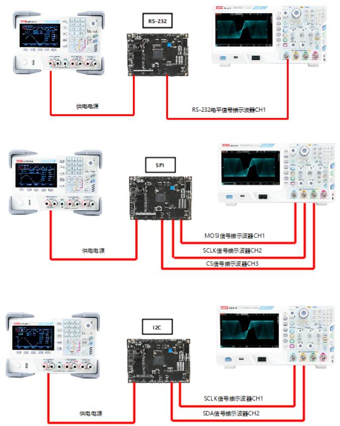 以上三種協(xié)議解碼借助優(yōu)利德協(xié)議解碼測試板UT-M13進行測試,UT-M13包含豐富協(xié)議解碼RS-232/USB/SPI/RS422/I2C/I2S等,采用線性穩(wěn)壓直流電源為板子供電,示波器進行解碼測試。