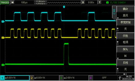 1.將示波器三組通道分別連接SPI協(xié)議解碼的CS/MOSI/SCLK三組信號,捕捉到信號,調(diào)節(jié)觸發(fā)將信號穩(wěn)定觸發(fā),調(diào)節(jié)三組信號的位置便于解碼觀察。