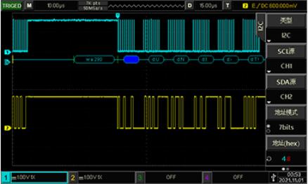 2.打開示波器中協(xié)議解碼功能選擇I2C協(xié)議解碼,將對應(yīng)的時鐘源與數(shù)據(jù)源選擇好對應(yīng)的通道后,設(shè)置地址模式和數(shù)據(jù)所在的地址,將結(jié)果使用ASCII碼格式顯示即可清晰的觀察到解碼的結(jié)果。