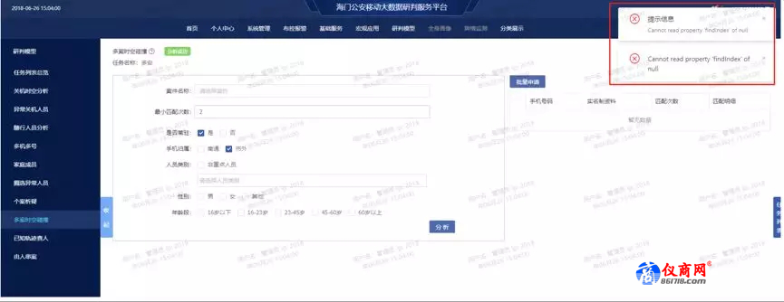 在羅網(wǎng)項(xiàng)目的某次回歸冒煙測試中,測試研判模型的多案時空碰撞模塊,正確創(chuàng)建分析任務(wù),在任務(wù)列表中查看分析結(jié)果,頁面右上角提示出錯,無法查看。