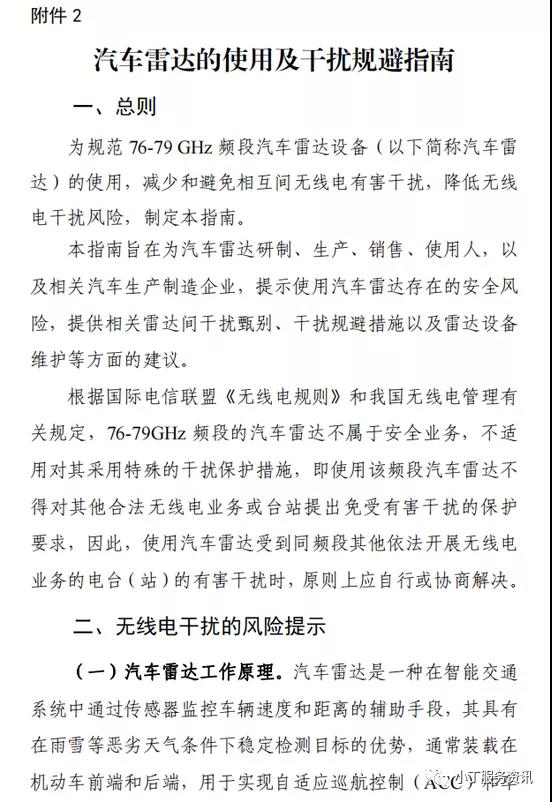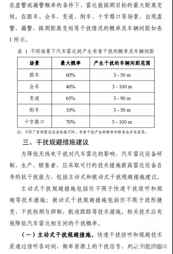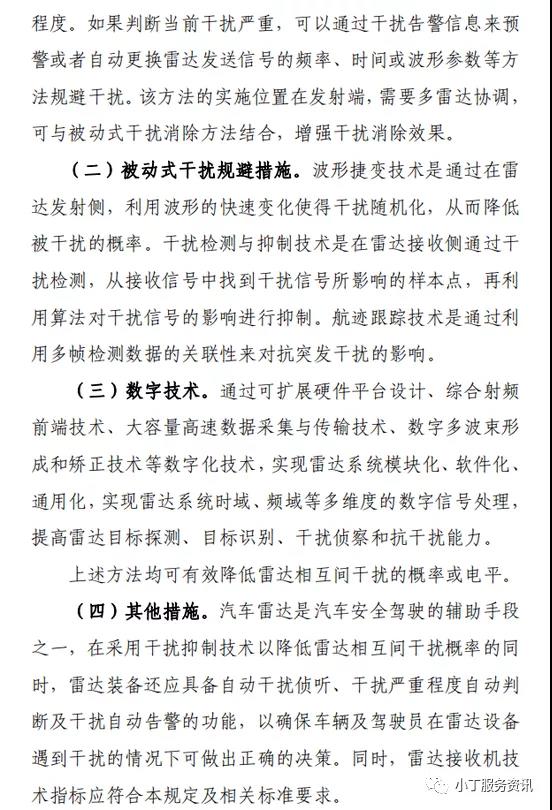 第八條 設(shè)置、使用汽車?yán)走_(dá)應(yīng)當(dāng)提高自身的抗干擾能力,通過采取主動(dòng)式、被動(dòng)式或數(shù)字技術(shù)的干擾規(guī)避措施(見附件2“汽車?yán)走_(dá)的使用及干擾規(guī)避指南”),緩解工作在同頻段汽車?yán)走_(dá)之間可能產(chǎn)生的有害干擾。