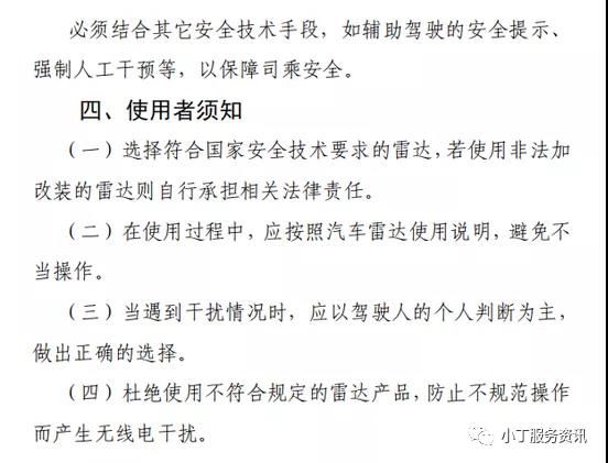 第四條 在76-79GHz頻段內(nèi)設(shè)置、使用汽車?yán)走_(dá),無需取得無線電頻率使用許可、無線電臺(tái)執(zhí)照,但應(yīng)當(dāng)遵守國家道路交通安全、環(huán)境保護(hù)、市場(chǎng)監(jiān)督管理等行政管理部門有關(guān)汽車性能、安全駕駛、產(chǎn)品質(zhì)量等法律法規(guī)和國家標(biāo)準(zhǔn)的要求。