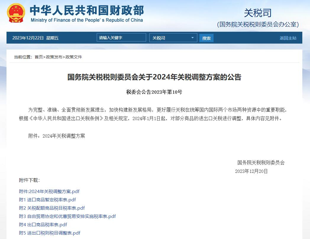 12月21日,國務院關稅稅則委員會發(fā)布2024年關稅調(diào)整方案公告。為完整、準確、全面貫徹新發(fā)展理念,加快構(gòu)建新發(fā)展格局,更好履行關稅在統(tǒng)籌國內(nèi)國際兩個市場兩種資源中的重要職能,根據(jù)《中華人民共和國進出口關稅條例》及相關規(guī)定,2024年1月1日起,對部分商品的進出口關稅進行調(diào)整。"