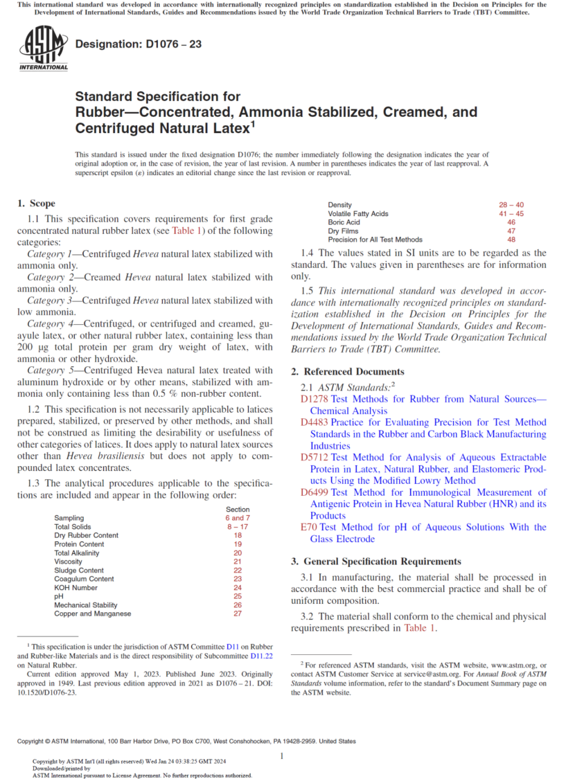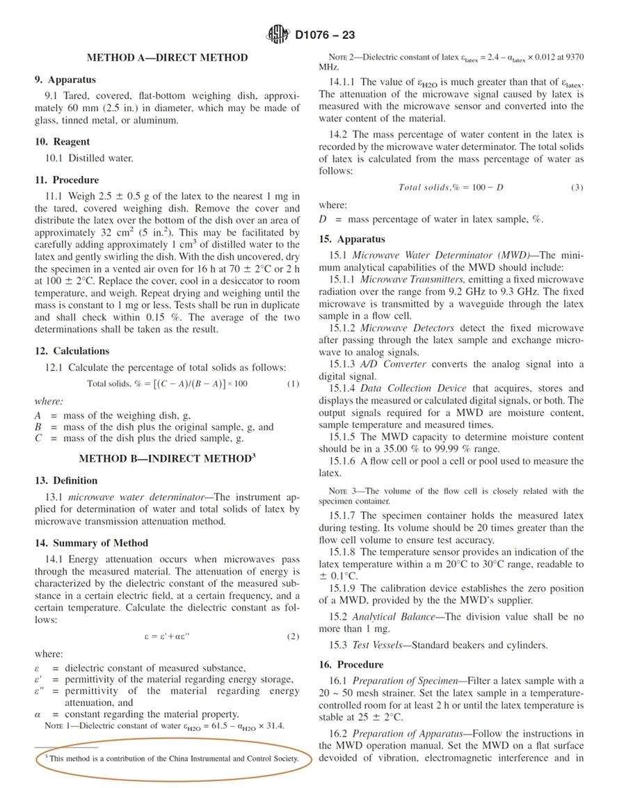 ASTM(國(guó)際材料與試驗(yàn)協(xié)會(huì))標(biāo)準(zhǔn)D1076-23“Standard Specification for Rubber—Concentrated, Ammonia Stabilized, Creamed, and Centrifuged Natural Latex”于日前發(fā)布實(shí)施。其中,中國(guó)儀器儀表學(xué)會(huì)標(biāo)準(zhǔn)T/CIS 17002-2018《膠乳水份測(cè)定 微波透射法》被轉(zhuǎn)化為該標(biāo)準(zhǔn)中的方法B。