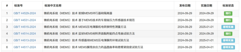 2024年9月29日,市場監(jiān)管總局(國家標準委)發(fā)布2024年第22號國家標準公告,批準發(fā)布《微機電系統(tǒng)(MEMS)技術 傳感器用MEMS壓電薄膜的環(huán)境試驗方法》(GB/T 44513-2024)等六項微機電系統(tǒng)(MEMS)技術國家標準,計劃于2025年4月前陸續(xù)實施。這六項國家標準由全國微機電技術標準化技術委員會(SAC/TC336)歸口,明確了MEMS材料界面結合能的四點彎曲試驗方法、MEMS膜殘余應力試驗方法等內容,在全國范圍內進一步統(tǒng)一了對MEMS相關試驗、測量方法及技術規(guī)范的認識,對推動微機電系統(tǒng)技術發(fā)展以及后續(xù)相關標準研制具有重要意義。