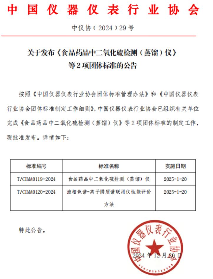 如今,這兩項團體標準已正式亮相,它們分別被賦予了獨特的編號:《食品藥品中二氧化硫檢測 (蒸餾) 儀》T/CIMA0119 - 2024,《液相色譜 - 離子阱質(zhì)譜聯(lián)用儀性能評價方法》T/CIMAO120 - 2024,這些編號如同它們的 “身份證”,標志著它們在行業(yè)中的正式地位,將成為行業(yè)內(nèi)各方遵循的重要規(guī)范。