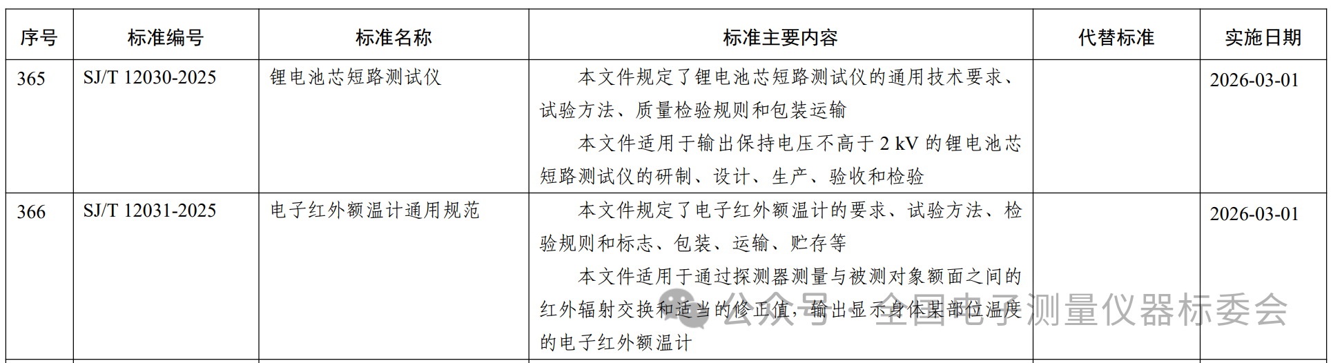 根據(jù)中華人民共和國工業(yè)和信息化部公告(2025年 第19號),由全國電子測量儀器標(biāo)準(zhǔn)化技術(shù)委員會歸口的《鋰電池芯短路測試儀》(標(biāo)準(zhǔn)號:SJ/T 10230-2025)《電子紅外額溫計通用規(guī)范》(標(biāo)準(zhǔn)號:SJ/T 10231-2025)等2項(xiàng)電子行業(yè)標(biāo)準(zhǔn)正式發(fā)布。